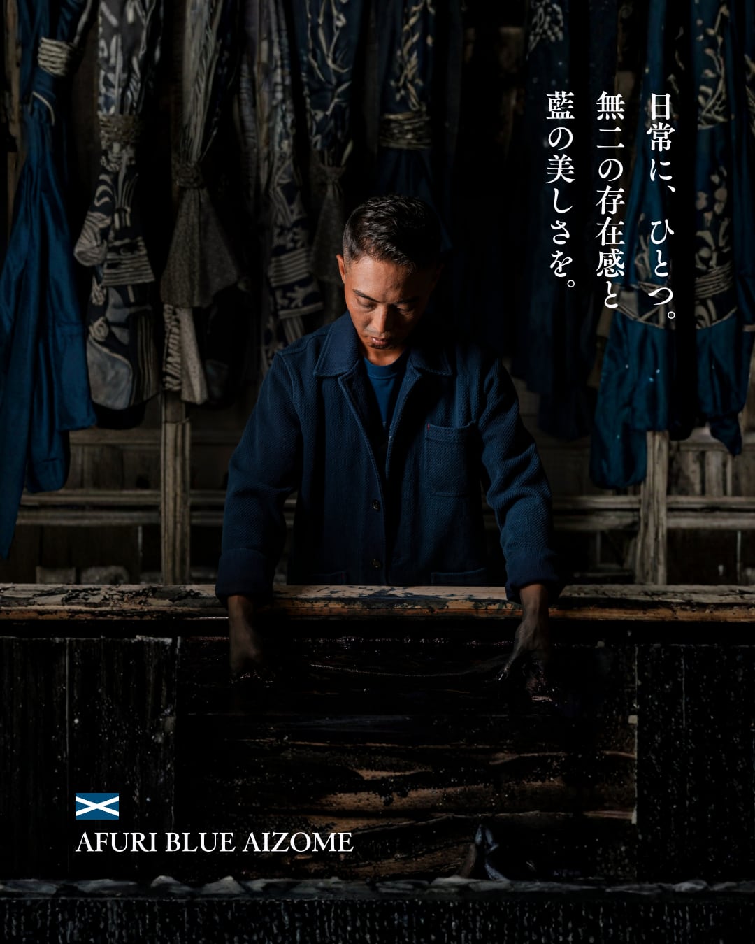 AFURI BLUE®の藍染めアイテムは、すべて藍染師の手による一点もの。伝統的な染色技法を現代のアパレルとして再構築しています。