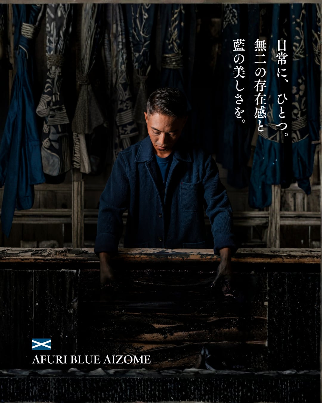 AFURI BLUE®の藍染めアイテムは、すべて藍染師の手による一点もの。伝統的な染色技法を現代のアパレルとして再構築しています。