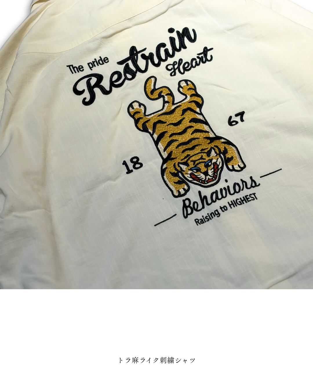 ●背面に大胆なタイガーラグ刺繍でインパクトをプラス●胸ポケットはシンプルなロゴ刺繍で上品な印象●麻ライクなさらさらの肌触りがくせになる着心地。●ゆったりシルエットでレイヤードしやすい●羽織として長いシーズンで活躍します●メンズライクなスタイルが好きな女性にもおすすめ